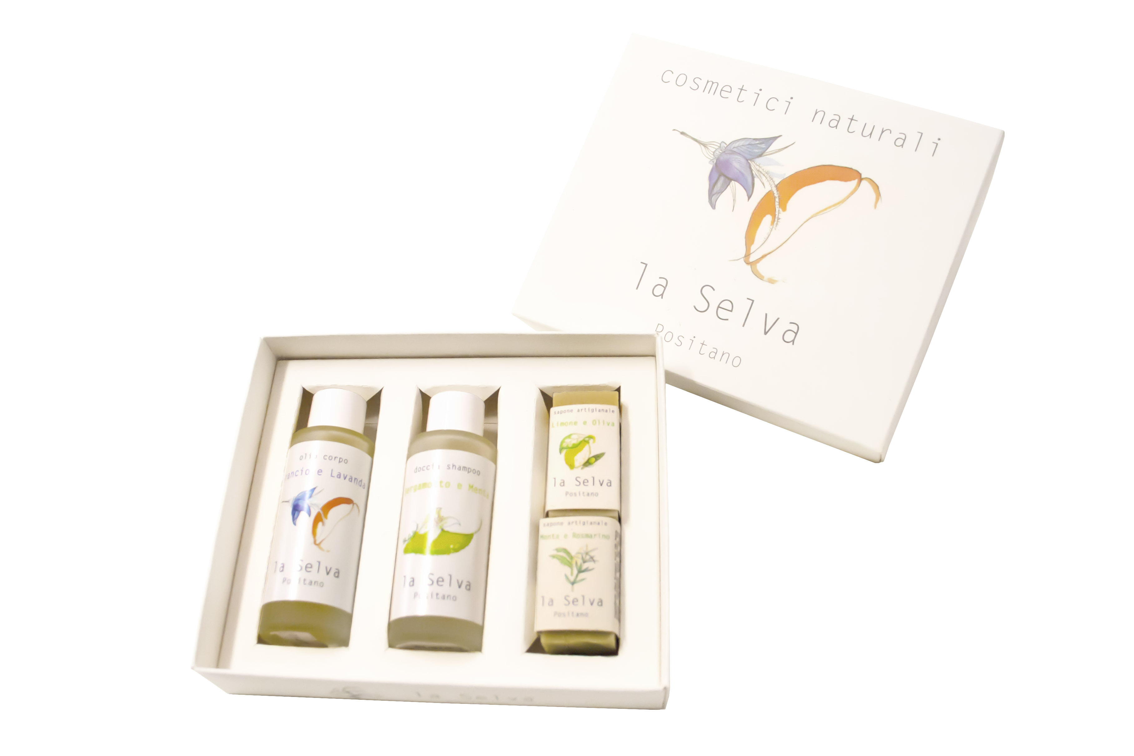 Si presta benissimo come idea kit regalo o come kit di cortesia per ville e alberghi che ricercano prodotti naturali ed ecologici. Nella scatola in cartoncino di betulla riciclata con una grafica accattivante, ci sono: un doccia- shampoo al bergamotto e menta a base di estratti vegetali, con oli essenziali puri, in un flaconcino di vetro satinato da 30ml. Un olio corpo lavanda e arancio dolce con oli di mandorle, borragine, albicocca, pesca, vinaccioli, mandorla, vitamina E pura, in un flaconcino di vetro satinato da 30 ml. Due saponi solidi da 30 gr. al limone e oliva e alla menta e rosmarino.